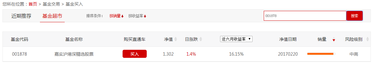 登入账户后:点击【基金交易】-【基金买入】-输入基金代码:001878,点击【搜索】
