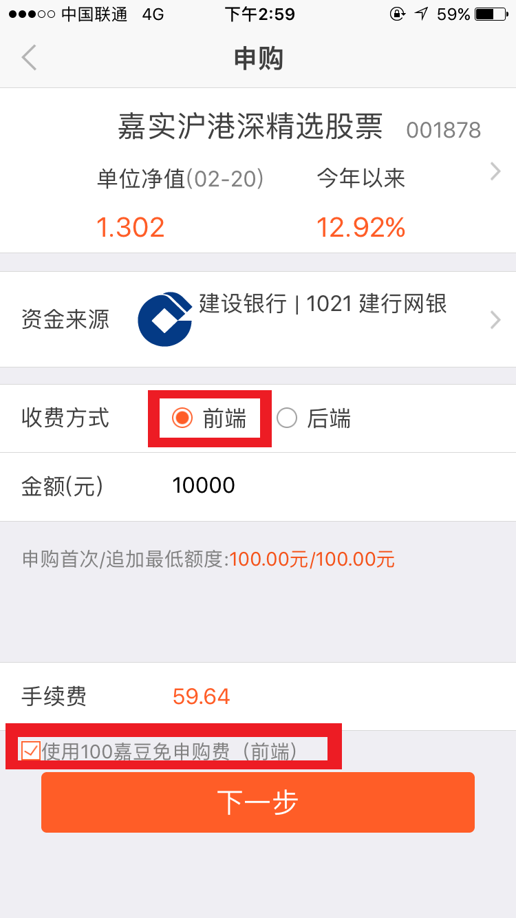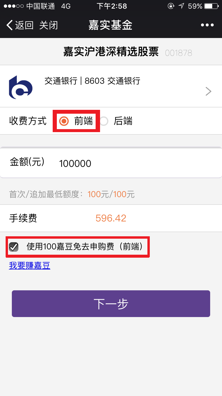 2)通过理财嘉、微信购买,选择前端收费,点选使用100嘉豆可以免除申购费。