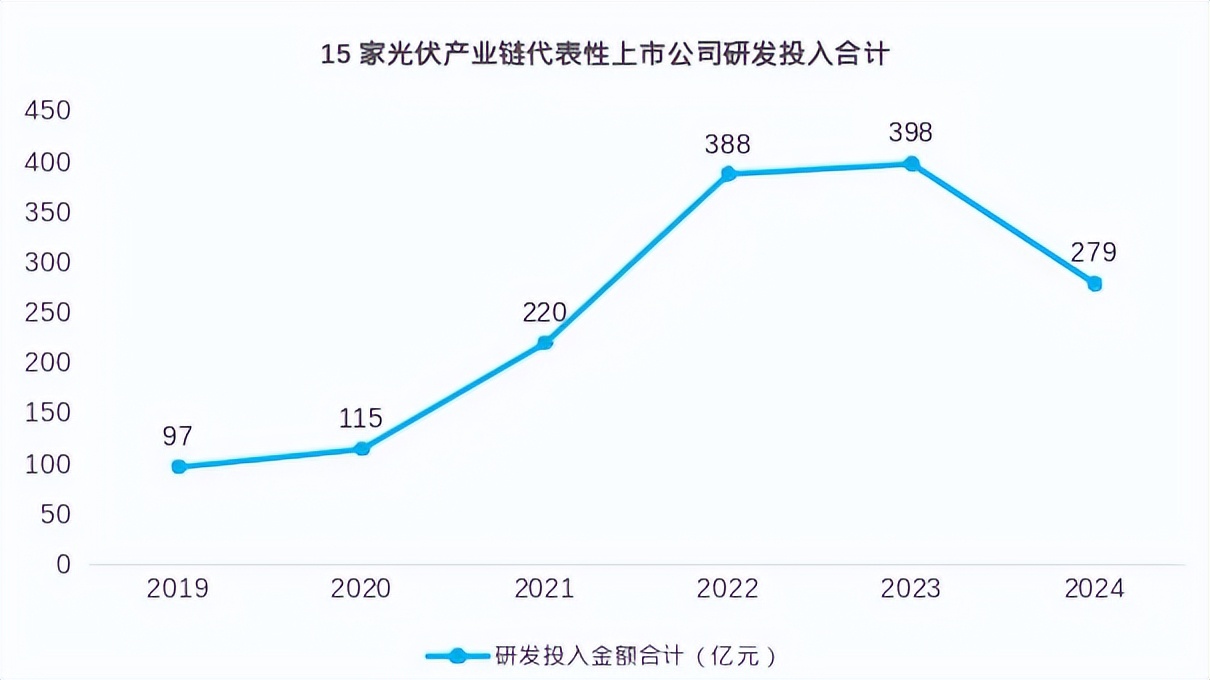 以光伏行业为例,受“内卷式”竞争影响,光伏产业创新动能明显衰减,具体体现在随着价格持续击穿成本线,企业为维持运营普遍削减研发投入。从研发投入金额看,15家光伏产业链代表性上市公司(覆盖硅料硅片、电池片、组件等)的研发投入总和从2023年的398亿元降至279亿元,下降30%;其中11家企业研发投入同比降幅超过30%,4家企业同比降幅超过60%。研发人员数量亦呈现相似趋势,15家光伏企业的研发人员总数从2023年的3.5万人降至2024年的3万人,同比下降14%。