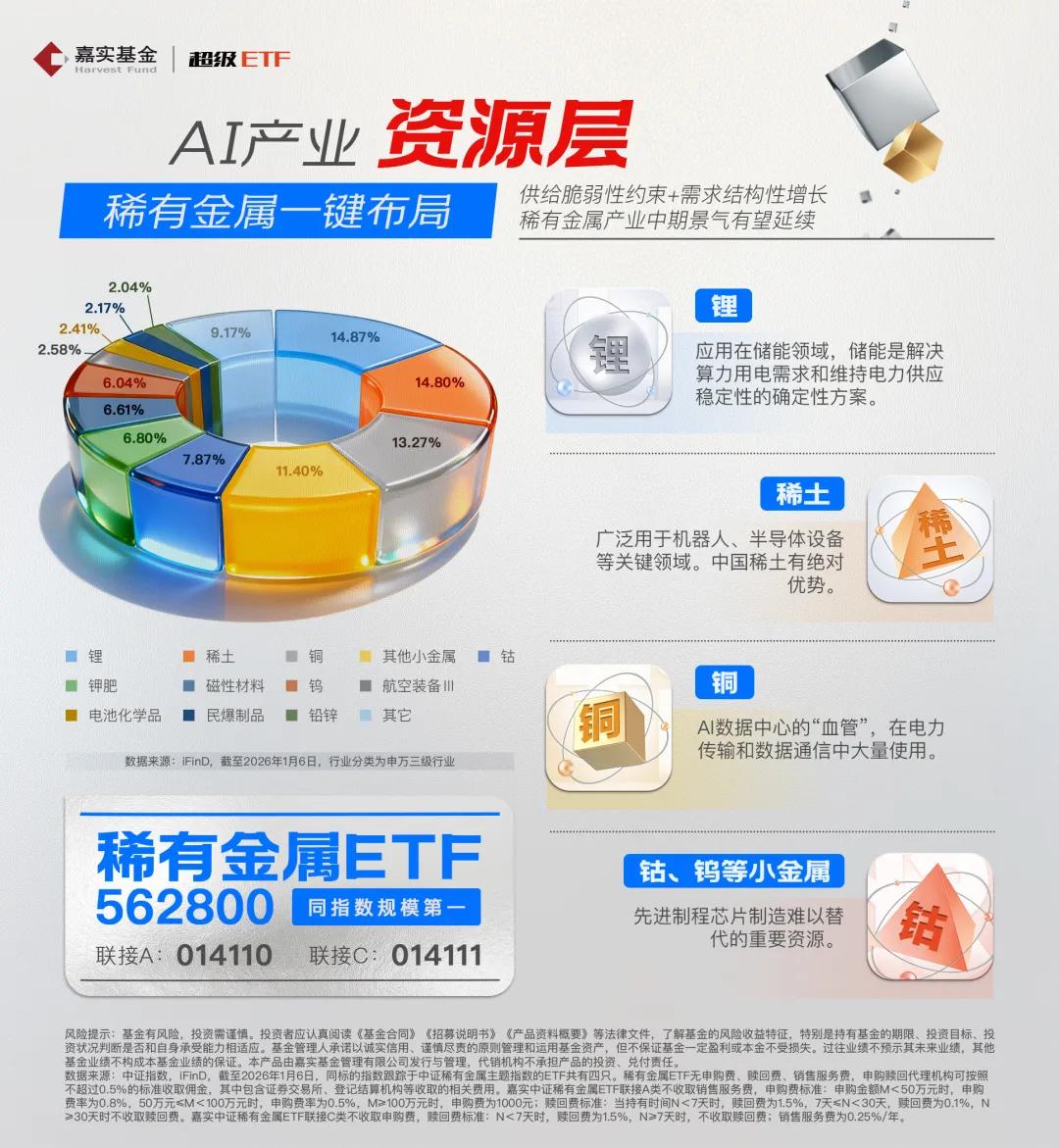 稀有金属ETF(562800)及联接基金(A类014110,C类014111 )跟踪中证稀有金属主题指数,覆盖有锂有稀土,可作为一键布局稀有金属采矿、冶炼和加工等产业链的便捷之选。