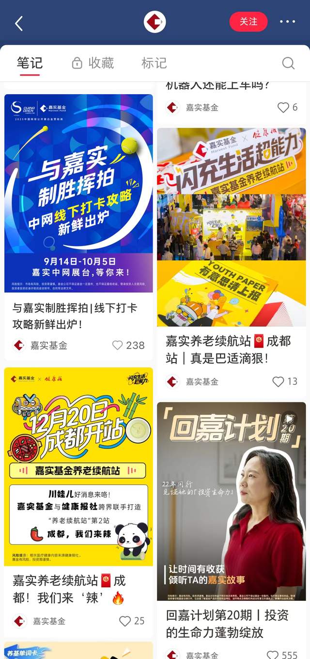 2025年嘉实基金在小红书平台摒弃传统晦涩的专业话术,将基金投资知识与用户的旅行计划、职业成长、兴趣培养等生活目标强绑定,通过真实的故事和场景化内容,将投教内容“种”进客户心里。我们开设了《养基单词卡》、《嘉些热点》、《退休嘉贝储能计划》、《搞钱必修课》等小红书定制栏目笔记,通过易懂的知识和情感连接,致力于将嘉实从一个遥远的投资专家形象,转变为一个“懂我所想”、“知我所需”的“投资生活同路人”。2025年全年嘉实基金小红书官方账号共发布92篇投教内容笔记,累计获赞与收藏超4.1万。未来,嘉实基金将继续深耕小红书平台,不断丰富“人感金融”的内涵,将这个充满生命力的社区,打造为我们与新一代投资者共同成长、彼此信任的核心阵地。