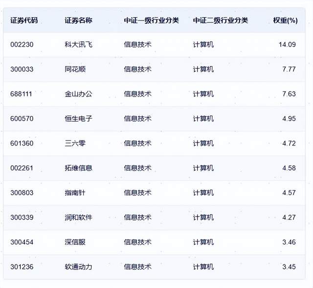 中证软件指数前十大权重股